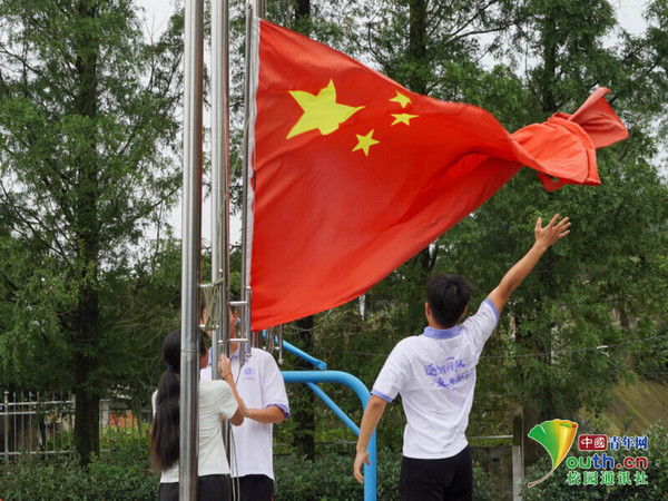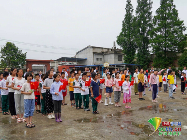 图为方铺小学学生和实践队员一起在操场参与升旗仪式(中国青年网通讯员邓远帆摄)