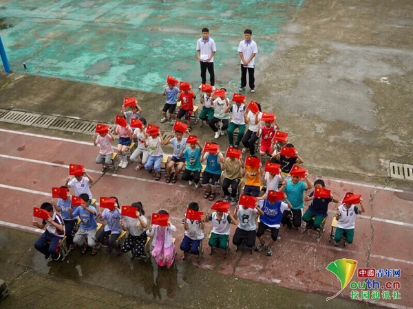 图为中年级组学生在跑道上摆出党徽造型(中国青年网通讯员邓远帆摄)