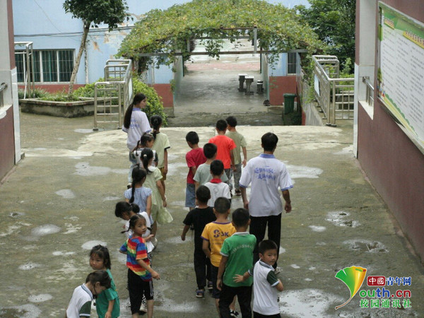 图为实践队员带领方铺小学学生前往操场排练节目(中国青年网通讯员邓远帆摄)