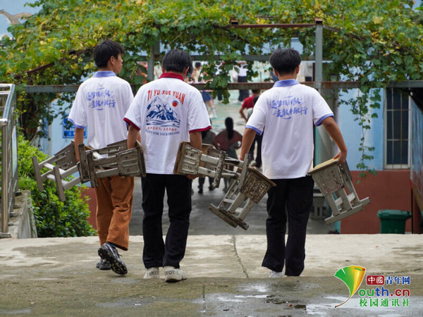 图为实践队员准备节目表演需要用的凳子(中国青年网通讯员邓远帆摄)
