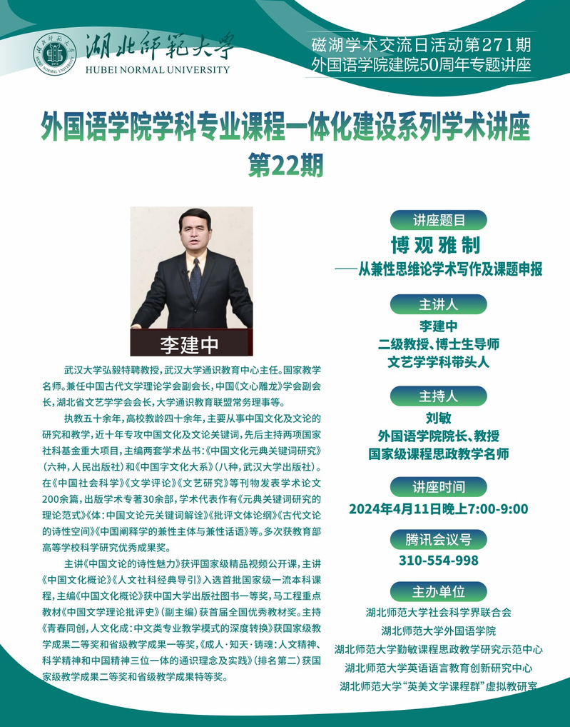 本网讯 为提升师生科研水平和文化素养,4月11日,武汉大学二级教授、博士生导师、文艺学学科带头人李建中应邀为我校外国语学院师生作了题为“博观雅制----从兼性思维论学术写作及课题申报”的线上学术讲座。外国语学院全体专任教师、兄弟院系教师、KY.COM“勤敏”课程思政教学研究示范中心成员高校师生代表参加本次讲座。讲座由外国语学院院长刘敏教授主持。