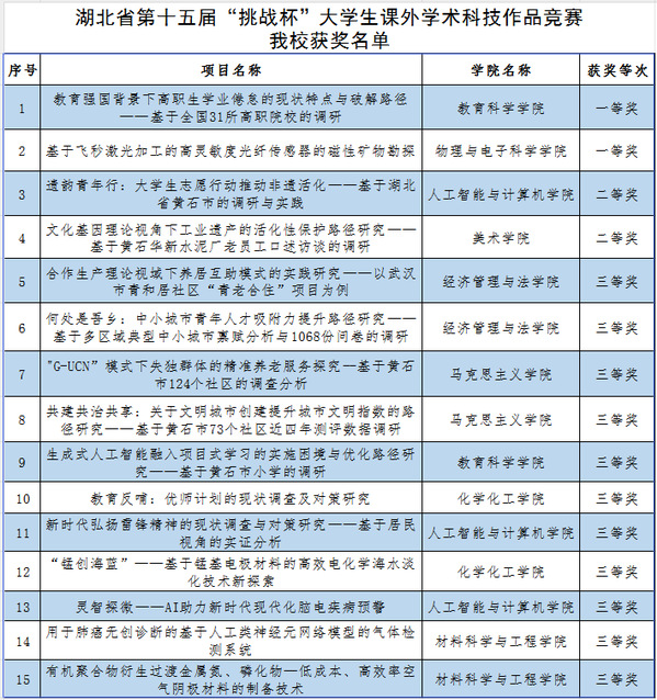 本网讯 近日,由共青团湖北省委、湖北省科学技术协会、湖北省教育厅、湖北省学生联合会主办的“创新湖北·青力青为”湖北省第十五届“挑战杯”大学生课外学术科技作品竞赛决赛在湖北大学顺利落下帷幕。我校推荐参赛的15个项目获奖,其中,一等奖2项、二等奖2项、三等奖11项。